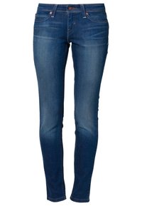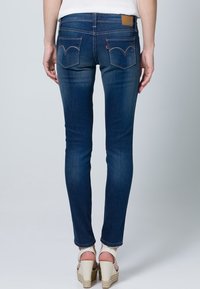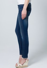 Jean skinny bleu foncé en denim, avec une conception à cinq poches et un léger effet délavé. La taille est munie d'une fermeture à bouton et d'une couture contrastante.