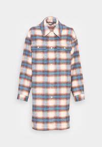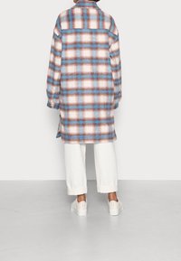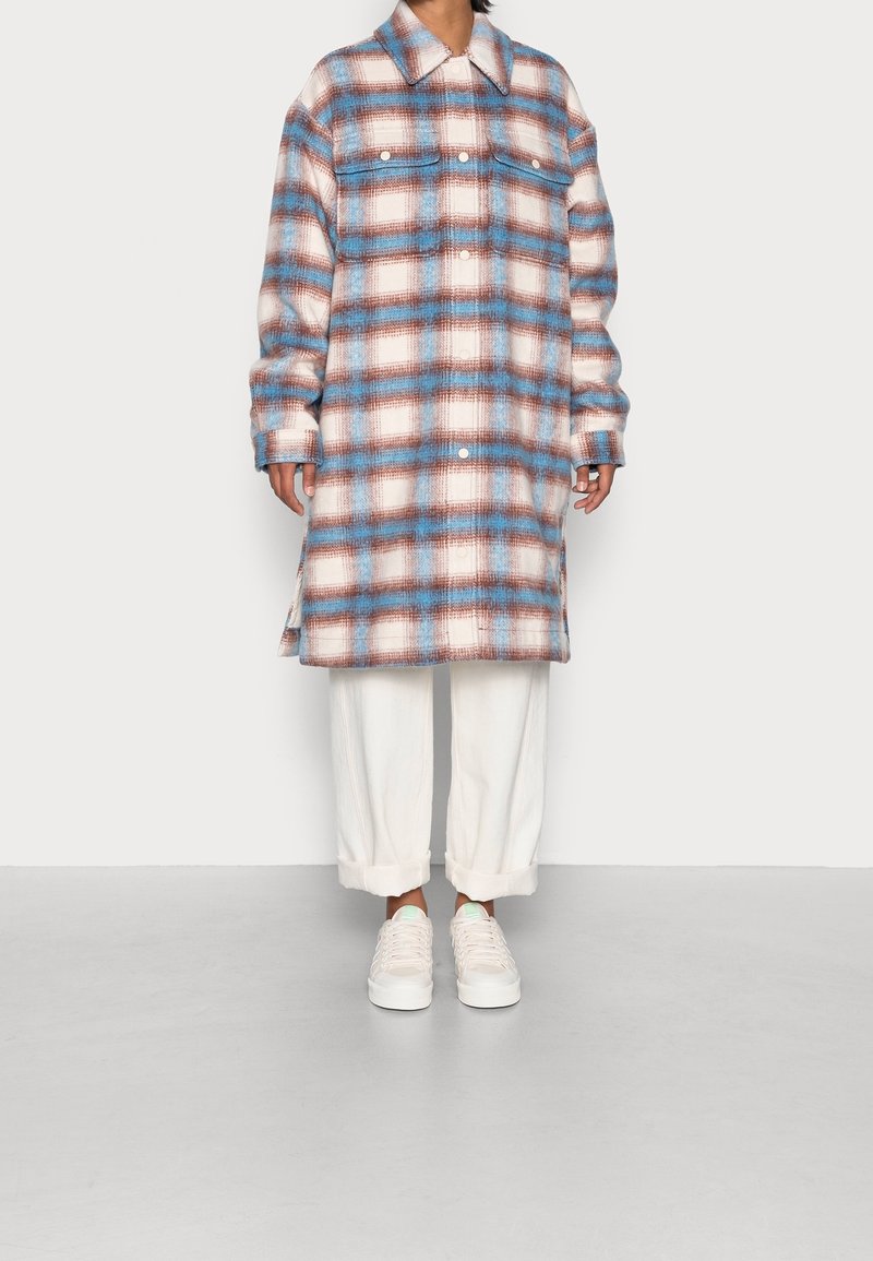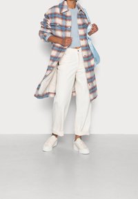 Personne portant un long manteau à carreaux boutonné en bleu, marron et blanc, avec un pantalon blanc retroussé et des baskets blanches, debout sur un sol gris.