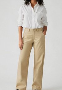 Pantalon beige à jambes droites porté avec une chemise blanche rentrée, mains dans les poches, et chaussures noires.