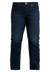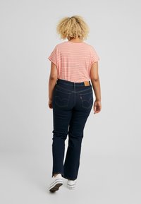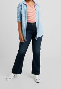 Femme portant un jean bleu foncé, des baskets blanches et un t-shirt rayé rouge et blanc, debout devant un fond clair uni.