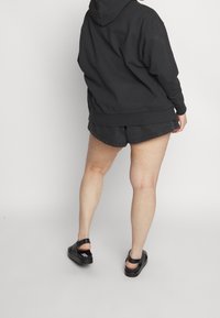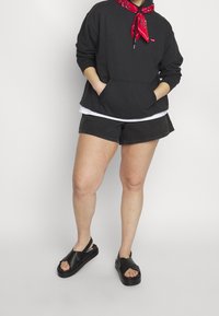Personne appuyée sur un fauteuil beige portant un sweat-shirt noir, un short noir, un bandana rouge et des sandales à plateforme noires sur un sol en bois.