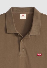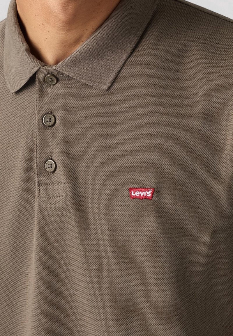 Homme portant un polo marron avec trois boutons et un petit logo rouge Levi's sur la poitrine gauche.