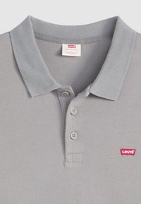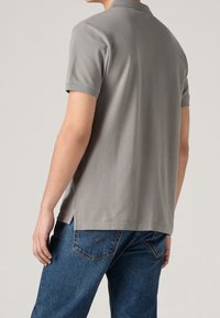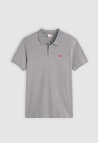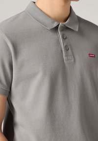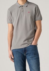 Polo gris à tissu texturé, avec une patte de boutonnage à trois boutons et un petit logo rouge sur la poitrine. Assorti à un jean bleu.