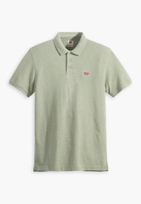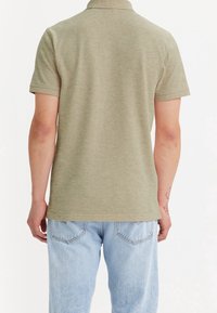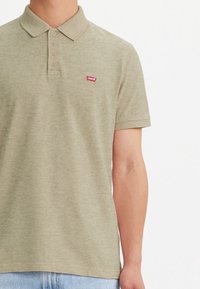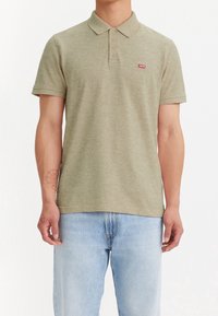 Polo shirt vert olive en coton, avec un col à trois boutons et un petit logo rouge au-dessus de la poitrine gauche, associé à un jean bleu clair.
