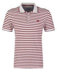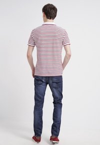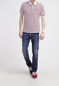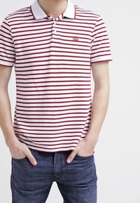 Homme portant un polo blanc à rayures horizontales bordeaux et un jean bleu, debout les mains dans les poches contre un fond blanc.
