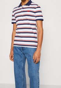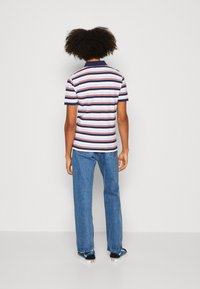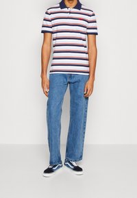 Homme portant un polo à manches courtes avec des rayures horizontales bleu marine, rouge, bleu clair et blanc, et un jean bleu, debout devant un fond uni.