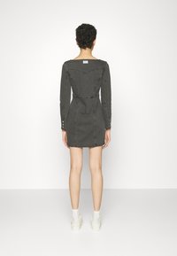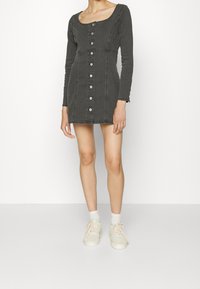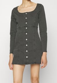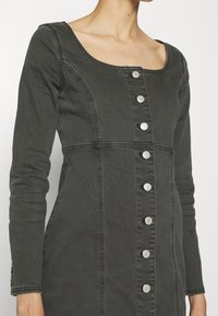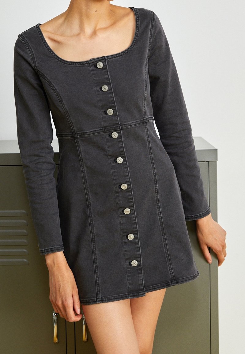 Robe en denim noir à manches longues, col carré, fermeture à boutons centrale et coutures apparentes. Texture lisse et coupe ajustée.