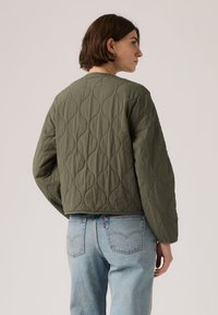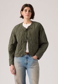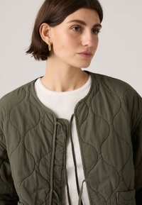 Femme portant une veste matelassée vert olive nouée à l'avant, chemise blanche, jean bleu clair et boucles d'oreilles créoles dorées, debout devant un fond uni.