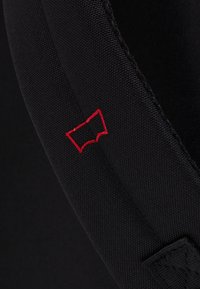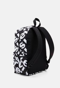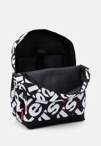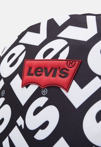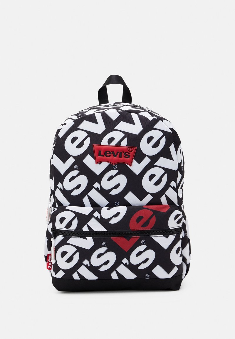 Sac à dos noir avec un motif répétitif du logo blanc "Levi's" et une étiquette rouge Levi's sur la poche avant.