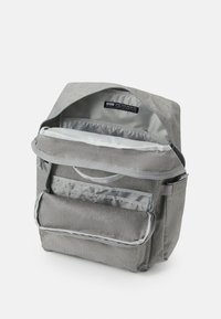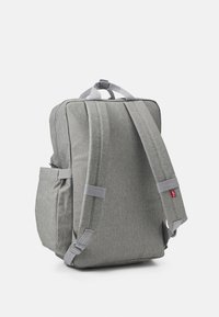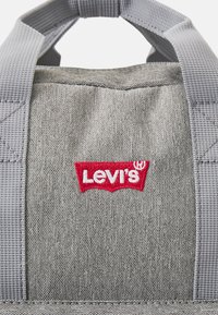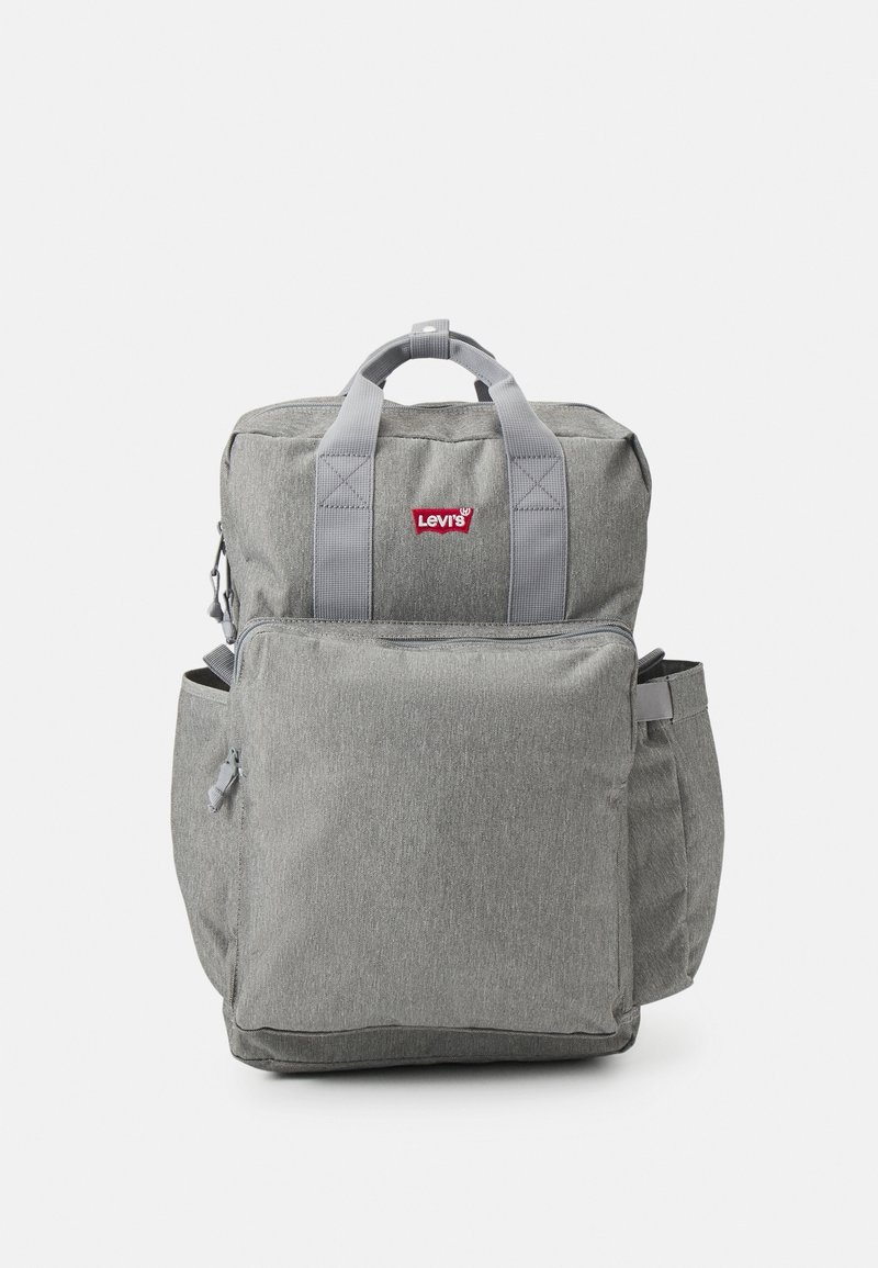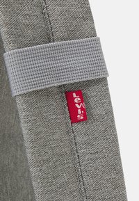 Sac à dos en tissu gris avec doubles poignées, poche zippée sur le devant, poche latérale, et logo rouge Levi's. Matériau texturé et forme rectangulaire.