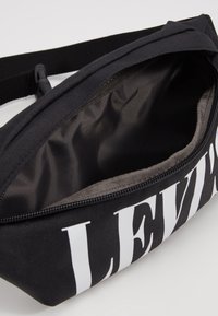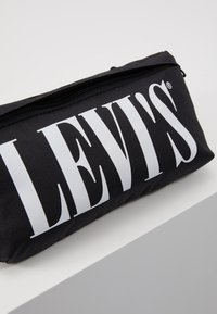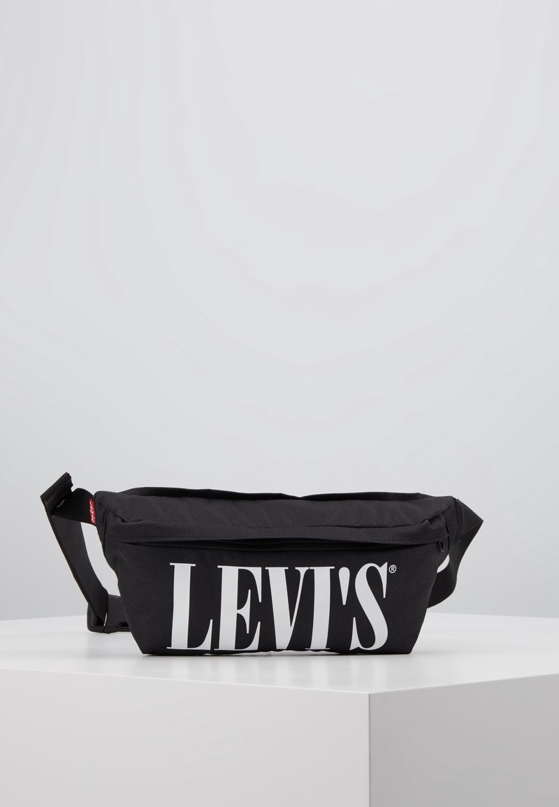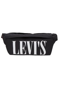 Sac à taille noir en tissu de forme rectangulaire, avec un grand logo blanc "LEVI'S" à l'avant et une sangle ajustable sur le côté.