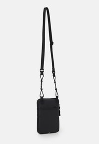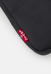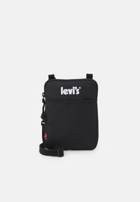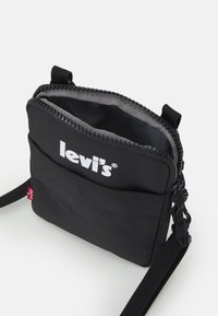 Sac Levi's noir en tissu durable, avec une poche avant, une bandoulière ajustable et un logo blanc bien visible sur le panneau avant.