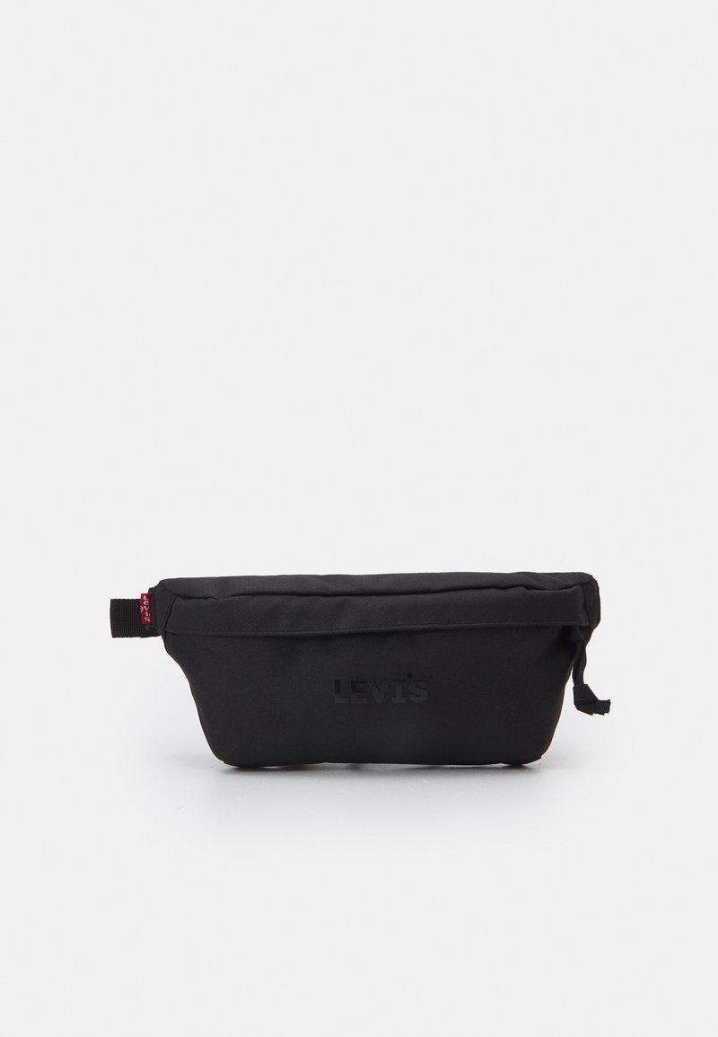 Trousse en toile noire avec une fermeture éclair sur le dessus, logo "LEVI'S" embossé à l'avant, et une petite étiquette rouge sur le côté. Design robuste et compact.