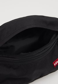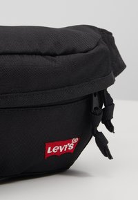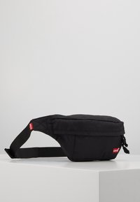 Sac banane Levi's noir avec compartiments zippés et sangle ajustable, présenté sur un socle blanc contre un fond uni.