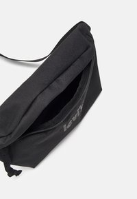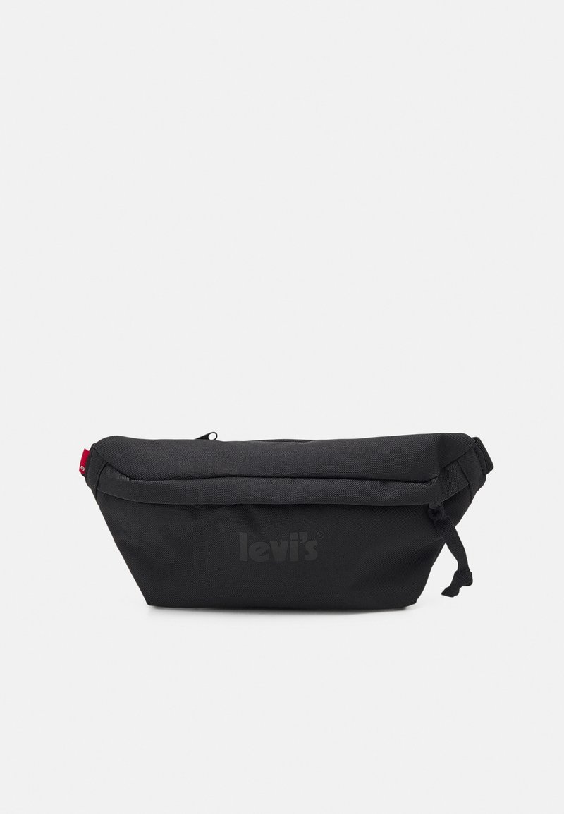 Sac banane en tissu noir avec une fermeture éclair, logo Levi's discret sur le devant et une sangle ajustable avec boucle.