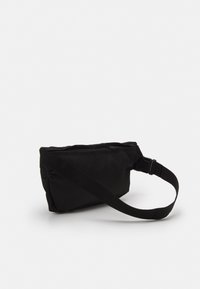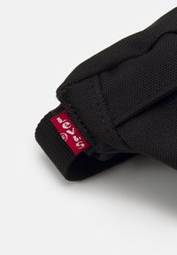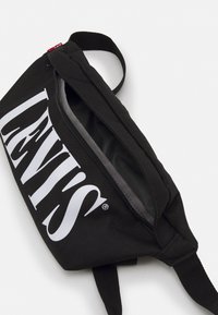 Sac banane en tissu noir avec un grand logo blanc "LEVI'S" sur le devant et une étiquette de marque rouge sur le côté, présenté sur un fond uni.