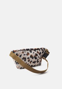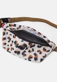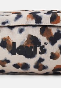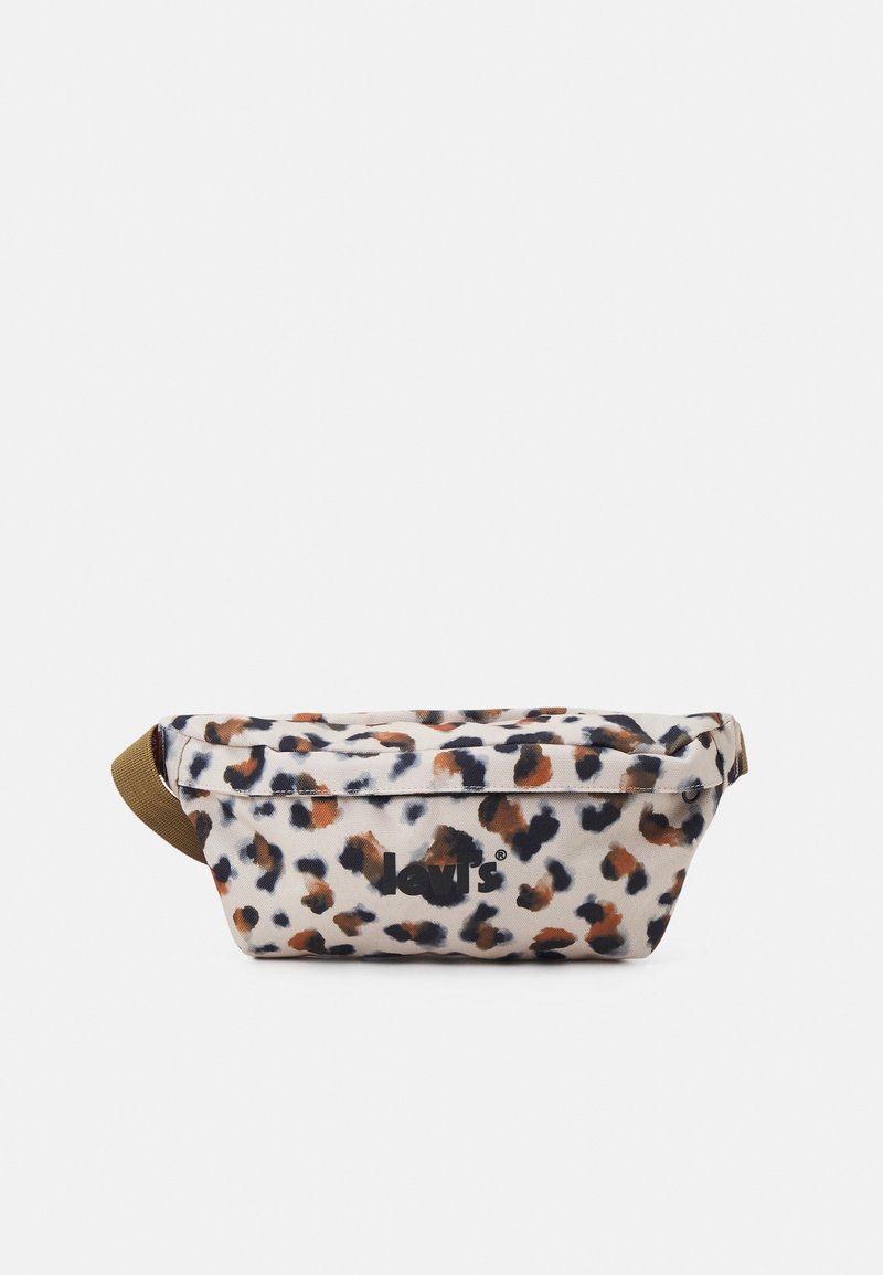 Sac banane en tissu à imprimé léopard de Levi's avec logo noir et sangle réglable marron sur fond blanc.