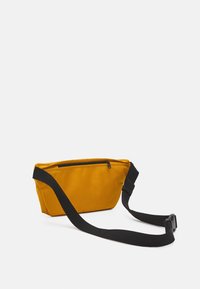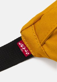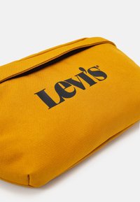 Sac banane en toile jaune avec une fermeture éclair. Présente le logo noir "Levi's" sur le devant et une étiquette rouge sur le côté. Texture lisse, forme structurée.