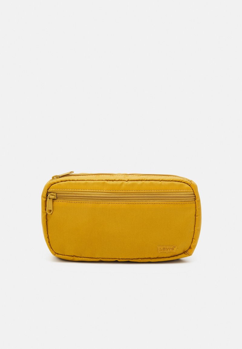 Trousse rectangulaire jaune avec fermeture éclair, petite poche externe et étiquette en tissu à l'avant, présentée sur un fond clair uni.