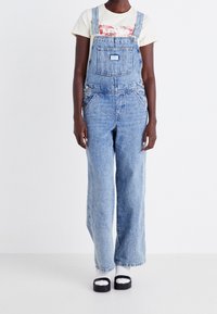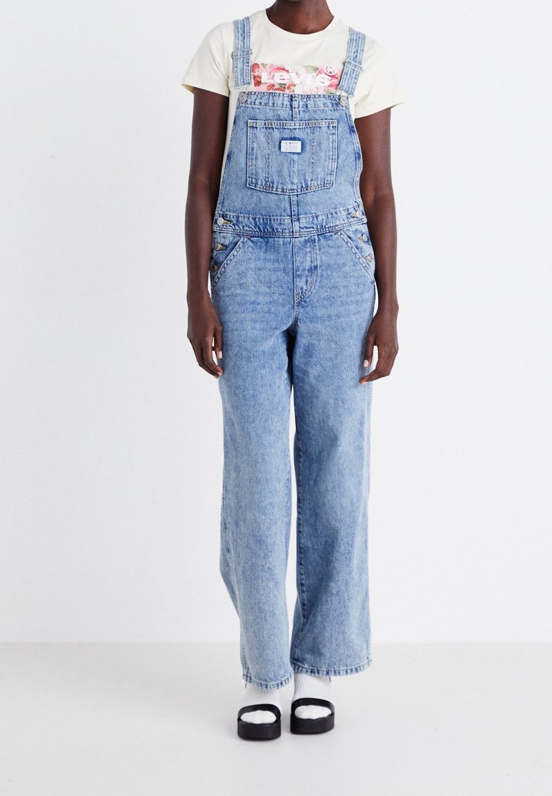 Salopette en denim bleu clair à coupe décontractée, avec une poche avant, des bretelles réglables et des poches latérales, portée avec une chemise crème à manches courtes.