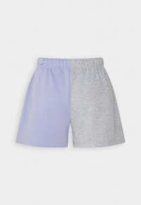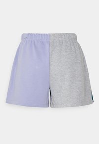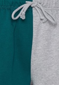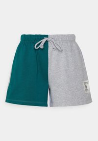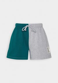 Shorts bicolores avec du bleu sarcelle à gauche et du gris à droite, taille élastique avec cordon gris, et petite étiquette avec le logo Levi's sur la jambe droite.