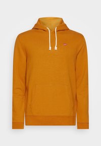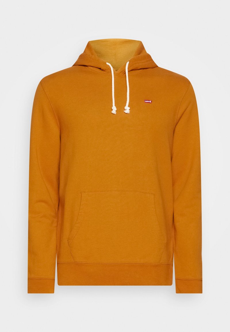 Sweat à capuche jaune moutarde avec cordons blancs, poche kangourou, et petite étiquette de logo rouge sur le côté gauche de la poitrine.