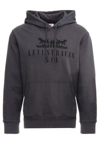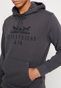 Sweat à capuche Levi Strauss & Co. gris foncé avec poche avant, capuche à cordon de serrage, et logo imprimé noir représentant deux chevaux et la date du brevet.