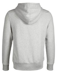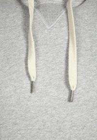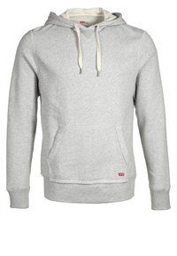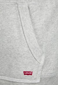 Sweat à capuche gris clair avec cordons blancs, poche kangourou à l'avant, poignets côtelés et petite étiquette rouge Levi's sur le bord de la poche.