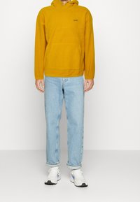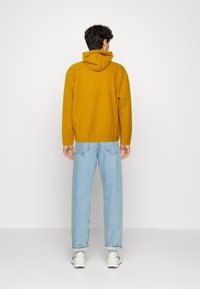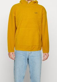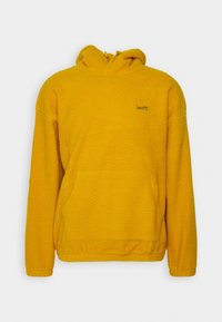 Haut en polaire jaune avec une poche kangourou et une capuche réglable, présentant un petit logo de marque brodé sur la poitrine.