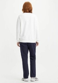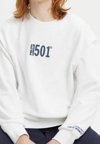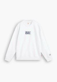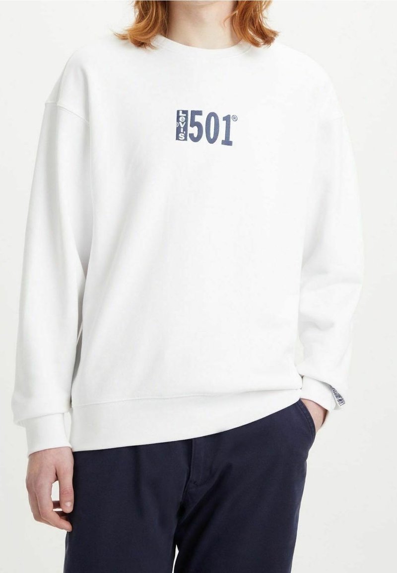 Sweat-shirt blanc à col ras du cou, tissu doux, avec le logo "Levi's 501" en bleu marine. Coupe ample avec poignets et ourlet côtelés, design simple.