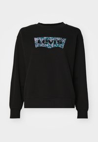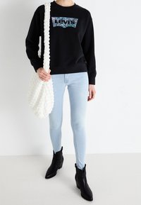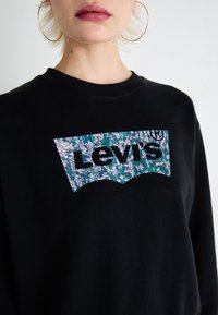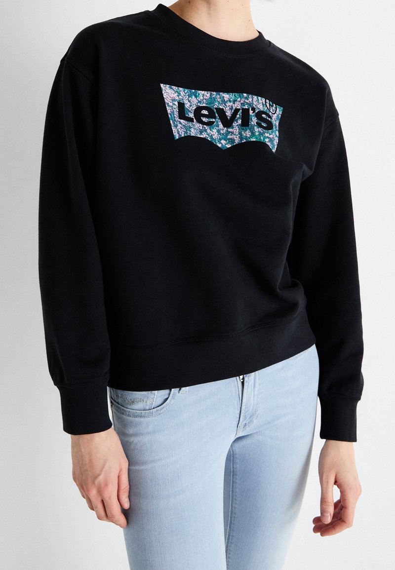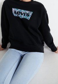 Personne portant un sweat-shirt noir Levi's avec un logo floral et un jean bleu clair, sur fond blanc uni.
