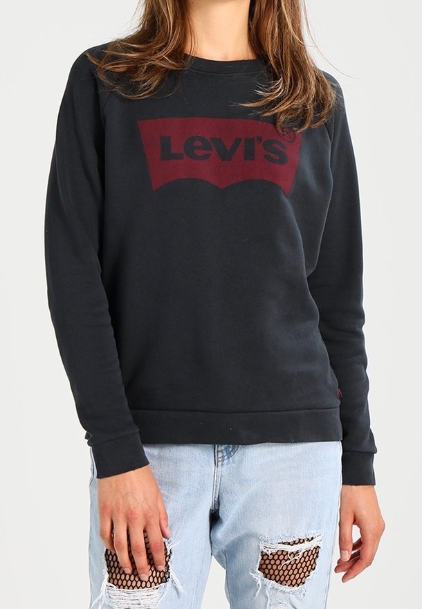 Femme portant un sweat-shirt noir Levi's et un jean bleu clair déchiré, avec des bas résille noirs visibles à travers les trous.
