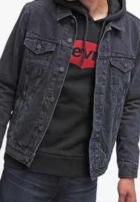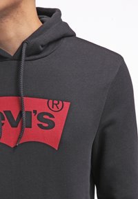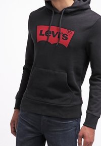 Sweat à capuche noir avec logo Levi's rouge sur la poitrine, porté par une personne les mains détendues sur les côtés, associé à un jean foncé.