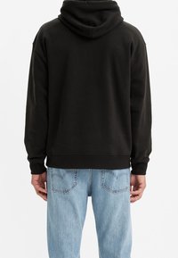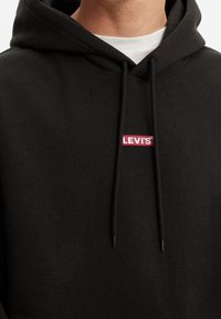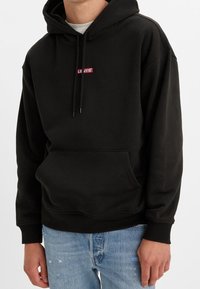 Personne portant un sweat à capuche noir Levi's avec poche avant et cordons, associé à un jean bleu clair déchiré.