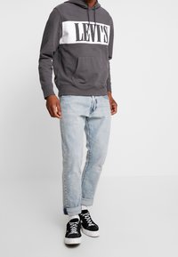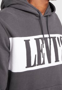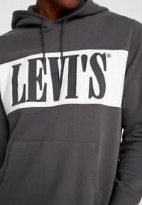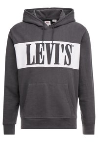 Homme portant un sweat à capuche Levi's gris foncé avec un panneau blanc et un grand logo, les mains jointes devant, porté avec un jean bleu clair.