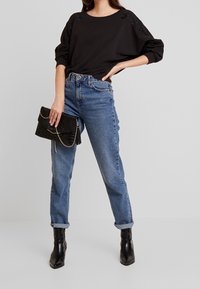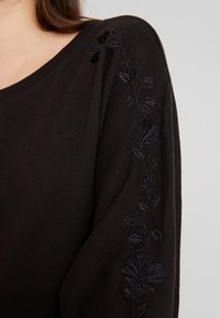 Femme portant un sweat-shirt noir à manches longues avec une broderie florale subtile sur les manches, associée à un jean bleu taille haute, main dans la poche.
