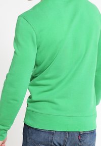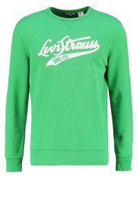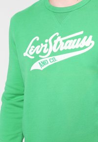 Homme portant un sweat-shirt Levi Strauss vert avec un logo blanc, associé à un jean bleu, sur un fond clair uni.