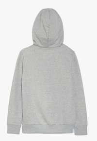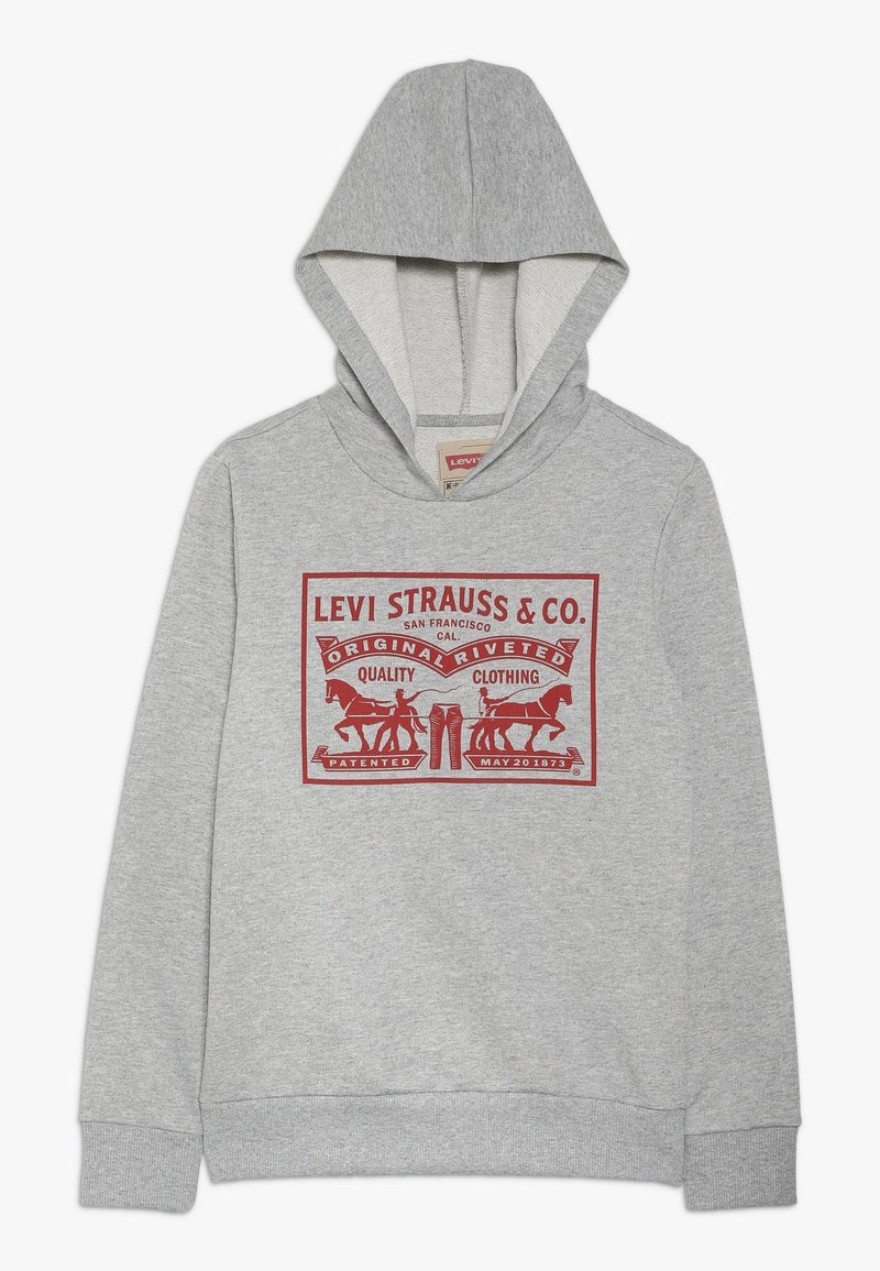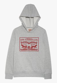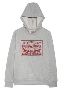 Sweat à capuche en coton gris clair, avec un imprimé graphique rouge d'animaux et de texte centré sur le devant. Poche kangourou en bas.