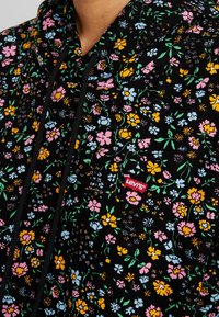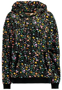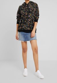 Personne portant un sweat à capuche noir avec de petits motifs floraux colorés et des poignets noirs, associé à une jupe en denim clair à ourlet effiloché.