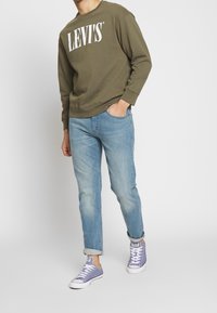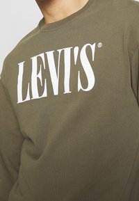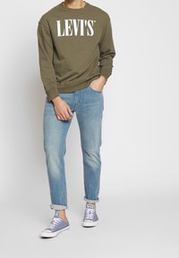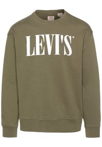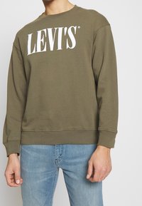 Homme portant un sweat-shirt Levi's vert olive avec un grand logo blanc et un jean bleu clair, debout devant un fond clair uni.