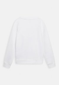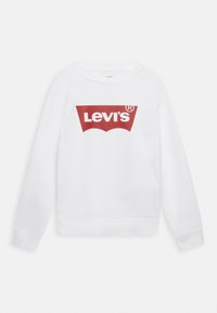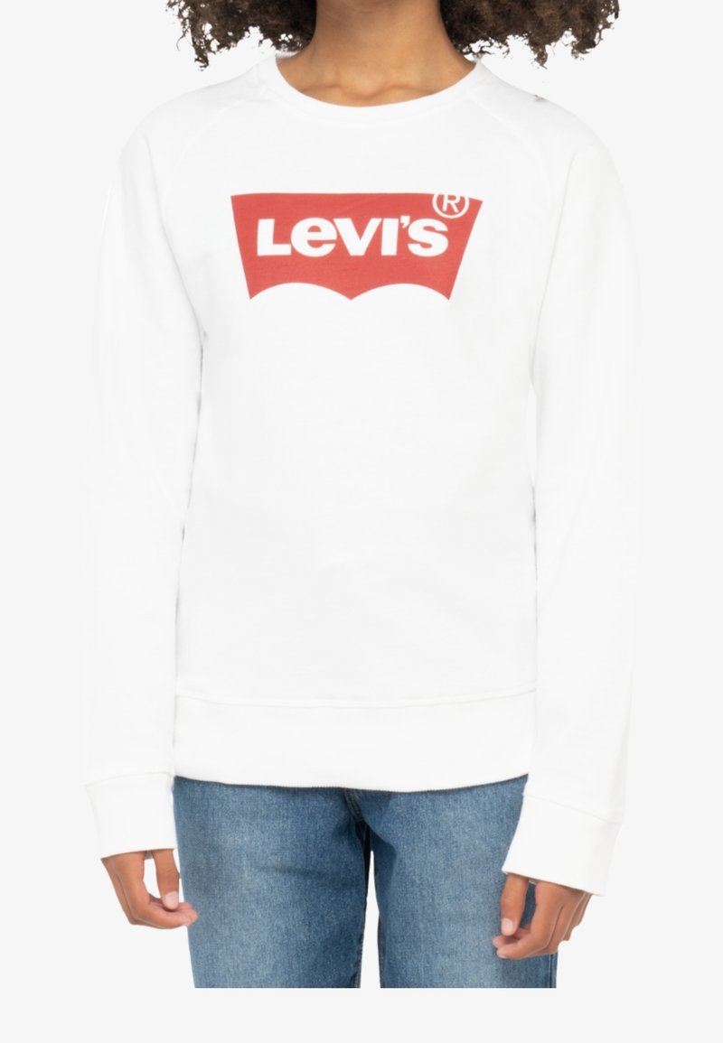 Sweat-shirt blanc avec le logo rouge de Levi's, présentant un col et des poignets côtelés, et une coupe décontractée, porté avec un jean bleu.