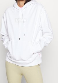 Personne portant un sweat à capuche blanc avec un logo "LEVI'S" multicolore, un jean bleu, se tenant devant un fond clair.