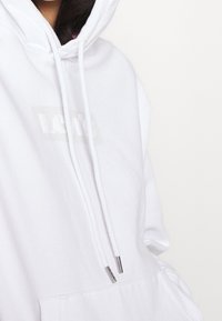 Sweat à capuche blanc avec cordons de serrage réglables, poche kangourou à l'avant et un logo discret sur la poitrine. Poignets et ourlet côtelés. Tissu doux.