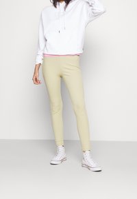 Haut à capuche jaune en tissu doux, comportant une poche avant, un cordon de serrage au niveau de la capuche et des poignets côtelés. Porté avec un pantalon blanc.