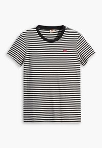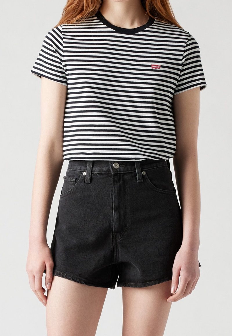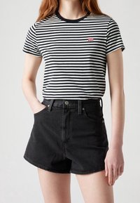T-shirt à rayures, à manches courtes, noir et blanc avec un col rond et le logo Levi's, assorti à un short en denim noir taille haute.