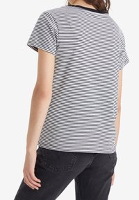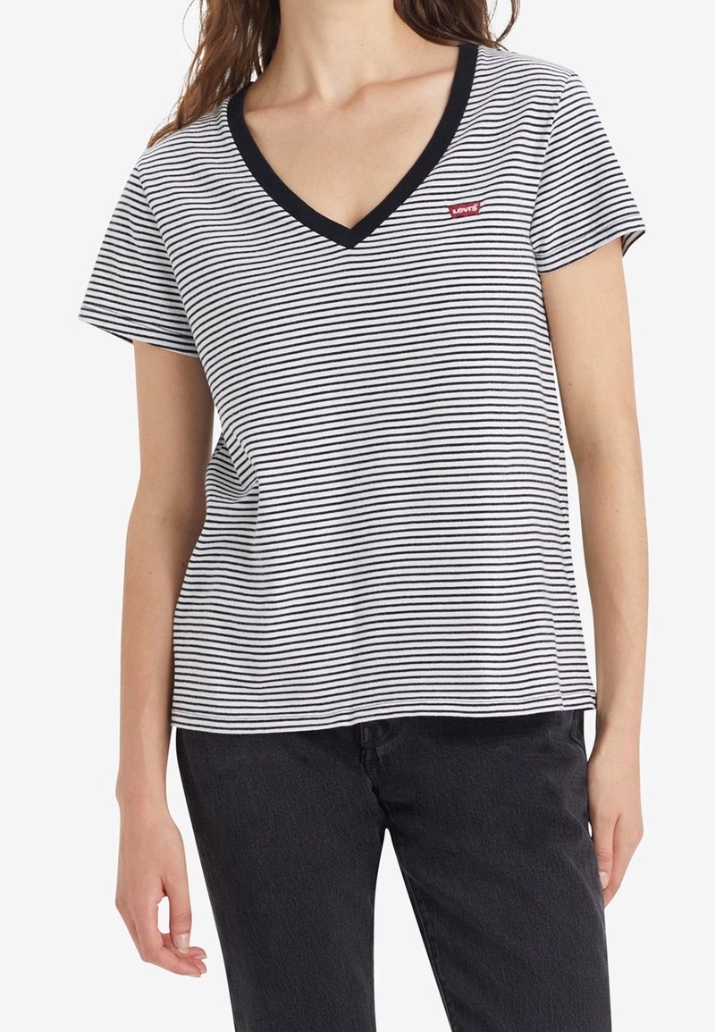T-shirt en coton rayé avec un col en V, présentant des rayures noires et blanches et un petit logo rouge Levi's sur la poitrine. Manches courtes.