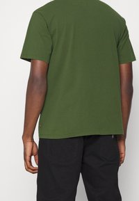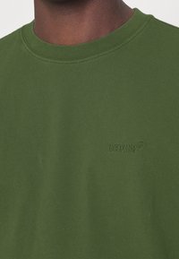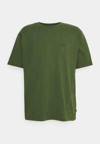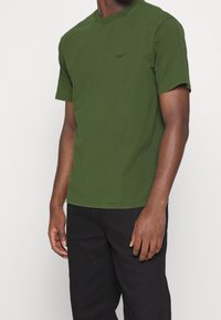 T-shirt à manches courtes et col rond en coton vert foncé, avec un logo Levi's discret sur la poitrine. Assorti à un pantalon noir.