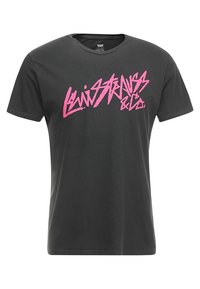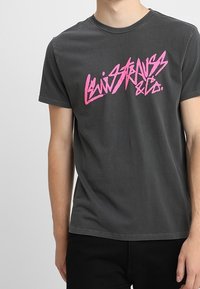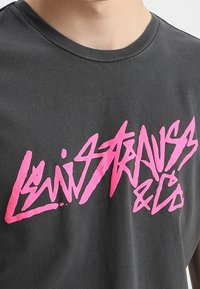 T-shirt en coton gris à manches courtes avec un grand texte graphique rose "Levi Strauss & Co." sur le devant. Dos uni, col rond standard.