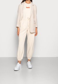 T-shirt en coton beige à manches courtes, col rond, avec le logo "Levi's" brodé en rouge sur la poitrine. Associé à un pantalon de jogging beige.