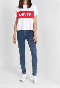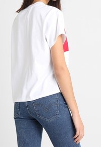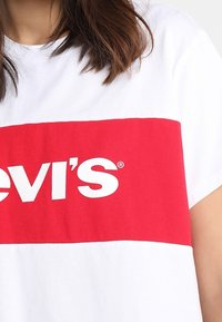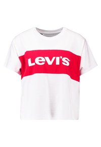 Personne portant un T-shirt blanc court avec un rectangle rouge et le logo blanc Levi's sur la poitrine, associé à un jean bleu.